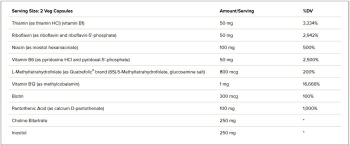 A balanced, hypoallergenic B-complex featuring the active forms of vitamins B1, B2, B6, B12 and Quatrefolic brand of (6S)-5-methyltetrahydrofolate.