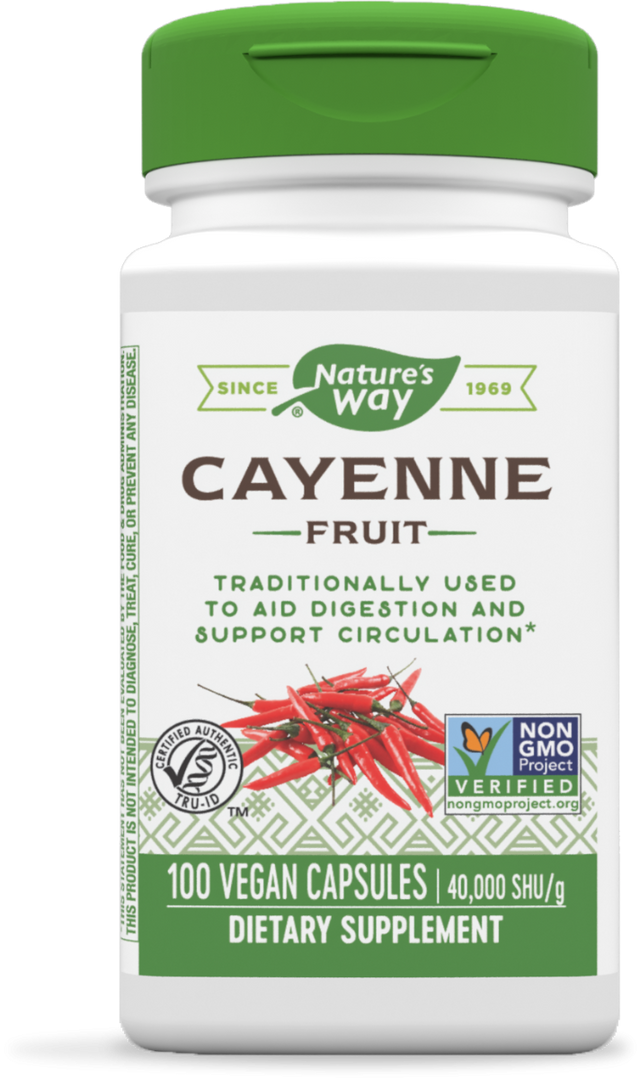 Nature's Way Cayenne and Pepper Description: .25% Caspian Potency Guaranteed Cayenne pepper fruit (capsicum annuum) is a blood-red warming herb that has an invigorating effect on several body systems. Special blending maintains a consistent potency of 40,000 hu (heat units). Cayenne is preferred by herbalists for its superior qualities. Disclaimer These statements have not been evaluated by the FDA. These products are not intended to diagnose, treat, cure, or prevent any disease.