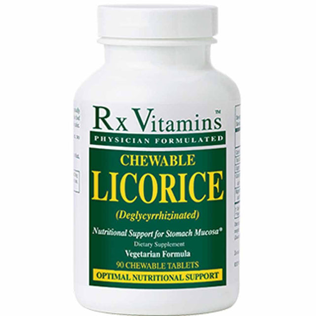 Rx Vitamins’ Chewable Licorice is a standardized extract of deglycyrrhizinated licorice (DGL). Licorice has a long history of health-related benefits and clinical studies have demonstrated its benefits in the treatment of gastric ulcers. Each tablet provides 500 mg. of pure DGL that has been flavored without the addition of any refined sugars. Licorice is listed as an approved herb in the German Commission E Monographs.