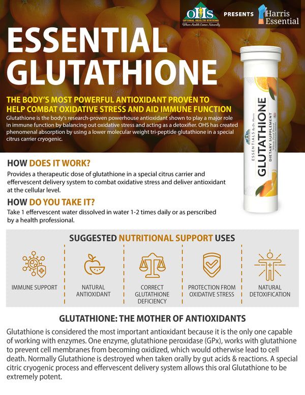 Contained within a special citrus carrier and effervescent delivery system, tri-peptide glutathione (glutamine, cysteine, and glycine) supports cell health and defends against the effects of aging.