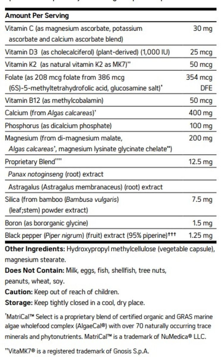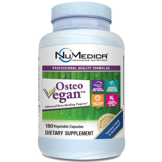 Osteo Vegan™ is an advanced, professional grade, plant-sourced calcium and bone building formula exclusively available through healthcare professionals. In two human clinical studies, patients who supplemented with Algas calcareas, the main component of Osteo Vegan™, along with proper diet and exercise, increased bone mineral density up to 4.33% in just one year. The highly specialized plant calcium in Osteo Vegan™ Rx is micronized to ensure optimal absorption by delivering the perfect particle size. It is a certified organic wholefood with over 70 naturally occurring trace minerals and phyto-nutrients. Since the calcium in this formula is an all-natural, GRAS certified, plant-derived wholefood, it does not have the potential negative effects on arterial calcification that non-food based calcium supplements have. Additionally, NuMedica® has selected a proprietary, clinically effective plant-derived form of D3, instead of the most common source, lanolin (sheep’s wool). D3 is essential for bone health and intestinal calcium absorption. Osteo Vegan™ includes an all trans-natural, patented form of K2 as MK7, which has been shown in human clinical studies to increase osteocalcin (calcium-binding protein) levels, enhancing the body’s ability to utilize calcium in the bloodstream. Patented Albion® magnesium is included for its superior absorption compared to other forms such as magnesium carbonate. This formula contains a broad spectrum of other bone-supporting nutrients and utilizes a proprietary blend of AstraGin™ and BioPerine® the latest in advanced absorption technology, for maximum effectiveness.* For best results, use with NuMedica’s OsteoV SC, an essential bone support formula.