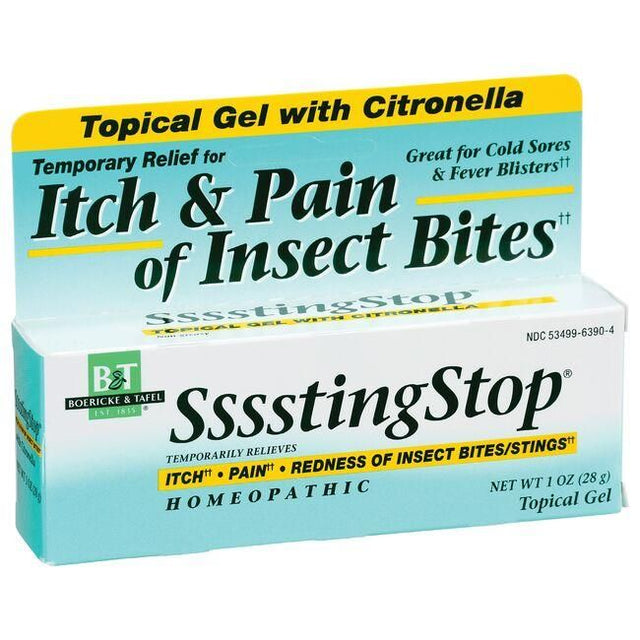 SssstingStop® Insect Gel provides natural relief for the itch, pain and redness of the non-poisonous insect bites and stings of mosquitoes, bees, wasps and other insects. In addition, it soothes the pain of fever blisters and cold sores. It is readily absorbed into the skin, with no burning or chilling, thus giving quick, effective relief.