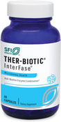Biofilm consists of microorganisms encased within a self-produced matrix of exopolysaccharides and exoproteins that strongly adheres to interfaces and resists dislodgement. Microorganisms residing within biofilms are highly resistant to antimicrobials including antibiotics and bacteriocins produced by probiotics. InterFase® is a unique enzyme formulation especially designed to disrupt the biofilm matrix that embeds potential gastrointestinal pathogens. Enzymes in InterFase® are selected for their ability to lyse the extracellular polymers commonly found in biofilm as well as degrade bacterial and yeast cell wall structures. InterFase® was developed using in vitro testing of antibiofilm activity and was found to have significant antibiofilm activity resulting in meaningful degradation of biofilm communities of potentially pathogenic bacteria and yeast. InterFase® is intended for use in conjunction with efforts to support normal gastrointestinal function and microflora. As an adjunct to other efforts to eliminate potential pathogens, it is best combined with use of a high-potency, broad, multispecies probiotic formulation and a prebiotic to encourage the formation of healthy intestinal microbial biofilm communities. It may also be combined with antimicrobial agents. The capsules should be taken away from meals to maximize the enzyme effects.