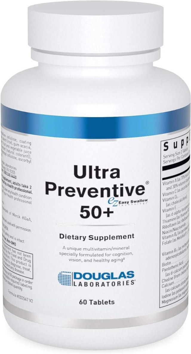 Ultra Preventive® 50+ is specially formulated with important vitamins, minerals, antioxidants and a proprietary fruit blend to support healthy aging in adults age 50. This product features CoQ10 for metabolic energy and heart health, lutein and zeaxanthin for healthy vision, lycopene for cellular support, bioavailable B vitamins, and Neurophenol®, a proprietary blend of blueberry and grape seed extract clinically studied for memory in healthy aging adults.*