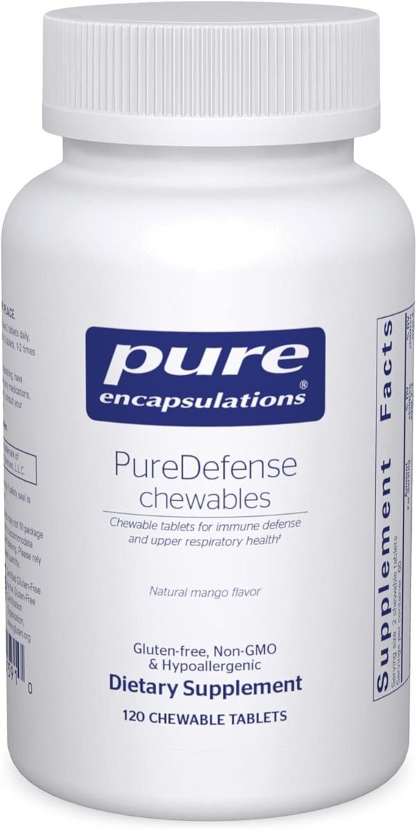 Improved *Great-tasting, chewable daily immune supportPureDefense chewables are a comprehensive blend of nutrients and herbal extracts designed to support immune function in a convenient, great-tasting, chewable tablet. EpiCor®saccharomyces cerevisiae fermentate contains numerous immune enhancing bioactive metabolites designed to support both innate and adaptive immune response. Research suggests that it enhances natural killer cell activation, B cell and T cell function, and secretory IgA levels. In two randomized, double blind, placebo-controlled trials, EpiCor® provided statistically significant support for upper respiratory tract health and overall immune health. Elderberry extract provides powerful immune enhancing anthocyanins, flavonoids and other polyphenols. Studies have shown statistically significant immune support in all ages. Quercetin maintains healthy mast cell function by supporting healthy enzyme activity. Zinc and vitamin C, provided as the non-acidic enhanced retention Ester-C®, helps promote immune defense by supporting immune cell proliferation, activation and function, as well as healthy antioxidant enzyme function.* PureDefense chewables provide overall immune defense and upper respiratory health support in a great-tasting chewable tablet.*Epicor® is a registered trademark of Embria Health Sciences, L.L.C.
