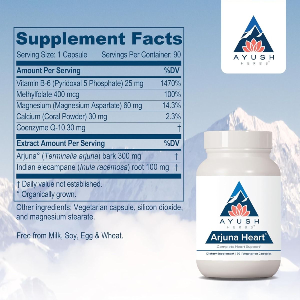 Arjuna-Heart™ is a formulation that has Terminalia arjuna, which in Ayurveda is used primarily as a support for healthy heart function* Extensive phytochemical analysis shows that this plant has Flavone arjnonlone, tannins, Arjunic acid, and glycosides, the effects of which may be correlated to the observed benefits of Arjuna. Vitamin B-6 and folic acid have long been known to support cardiac health*. Magnesium supports in the production of adenosine triphosphate (ATP), the main energy storage and transfer molecule in the cell*. Magnesium also helps to support heart health and pulmonary function*.