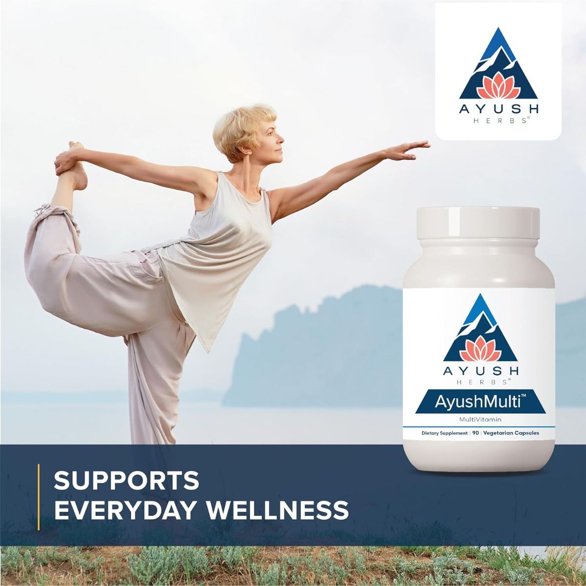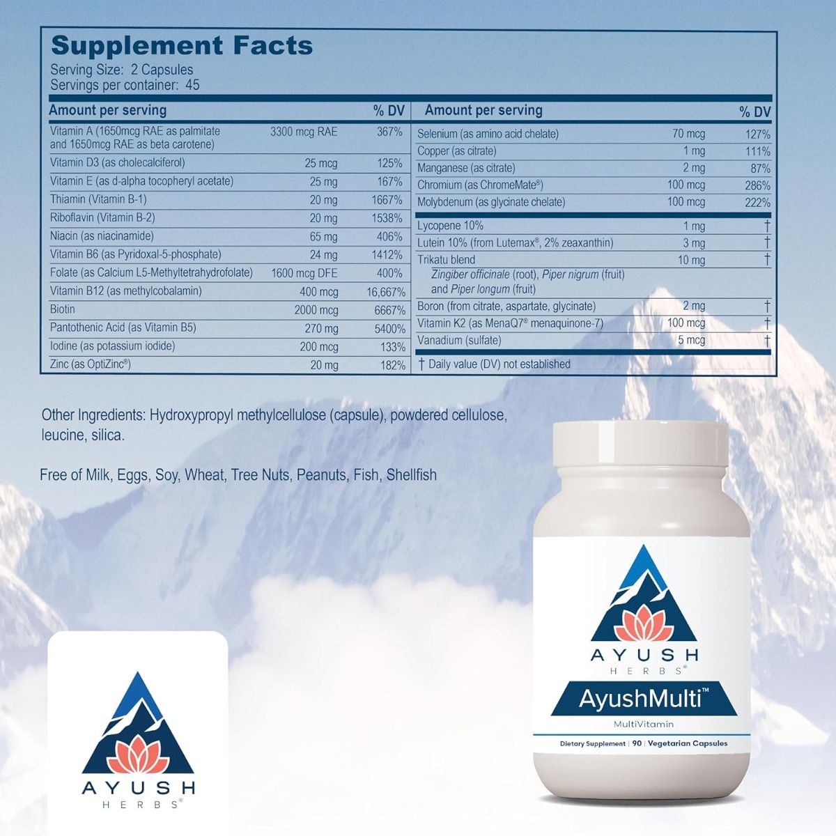 Ayush Multi also includes B vitamins for reducing occasional stress and maintaining healthy heart function. Vitamin D is added for proper calcium absorption, improved immune function and maintaining normal blood pressure levels already within normal range. Also included are vitamin E, vitamin K, beta-carotene, and selenium for their antioxidant activity and iodine for supporting immune function. The carotenoid lutein provides antioxidant support and our new improved formula includes methylated B-vitamins such as methylfolate. Just two capsules deliver or exceed the RDI values of all these nutrients, making our multivitamin an economical and convenient way to deliver maximum nutritional value.