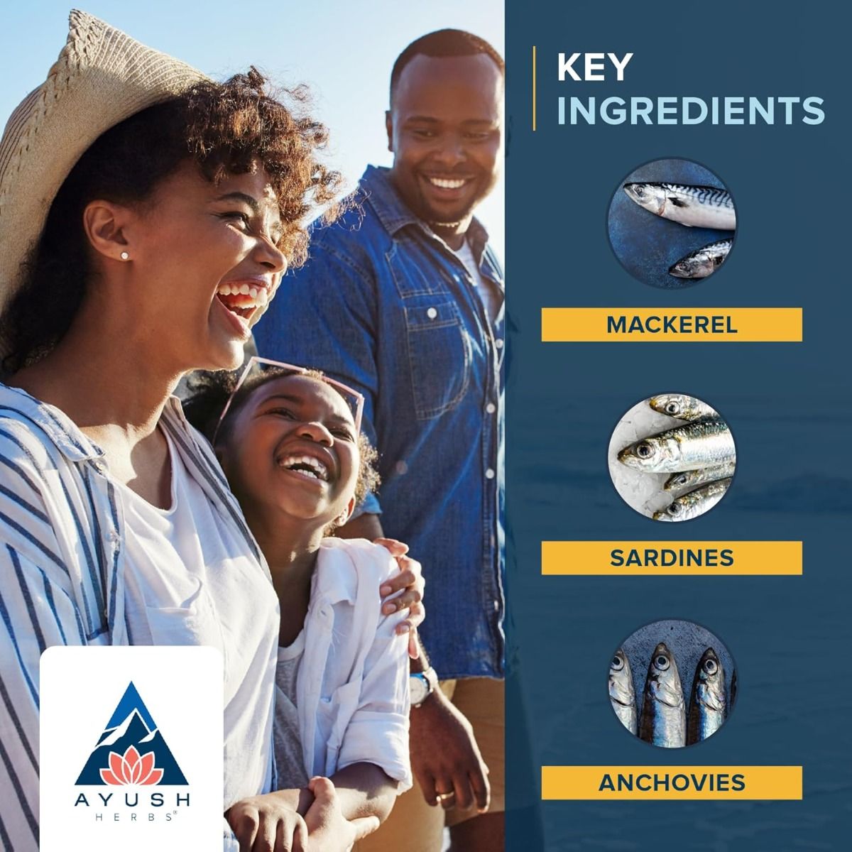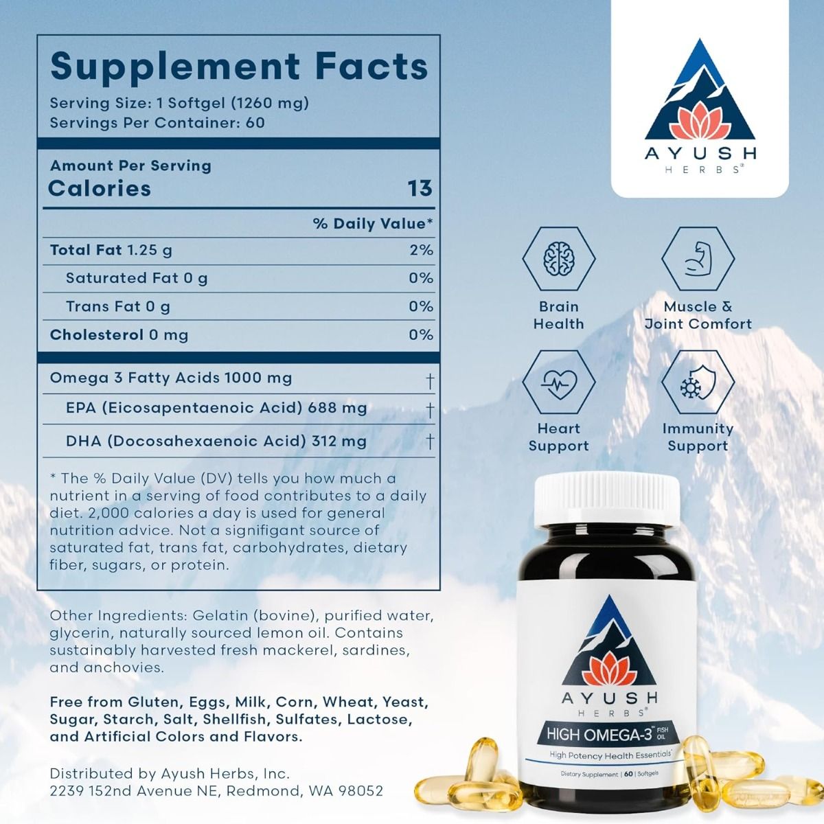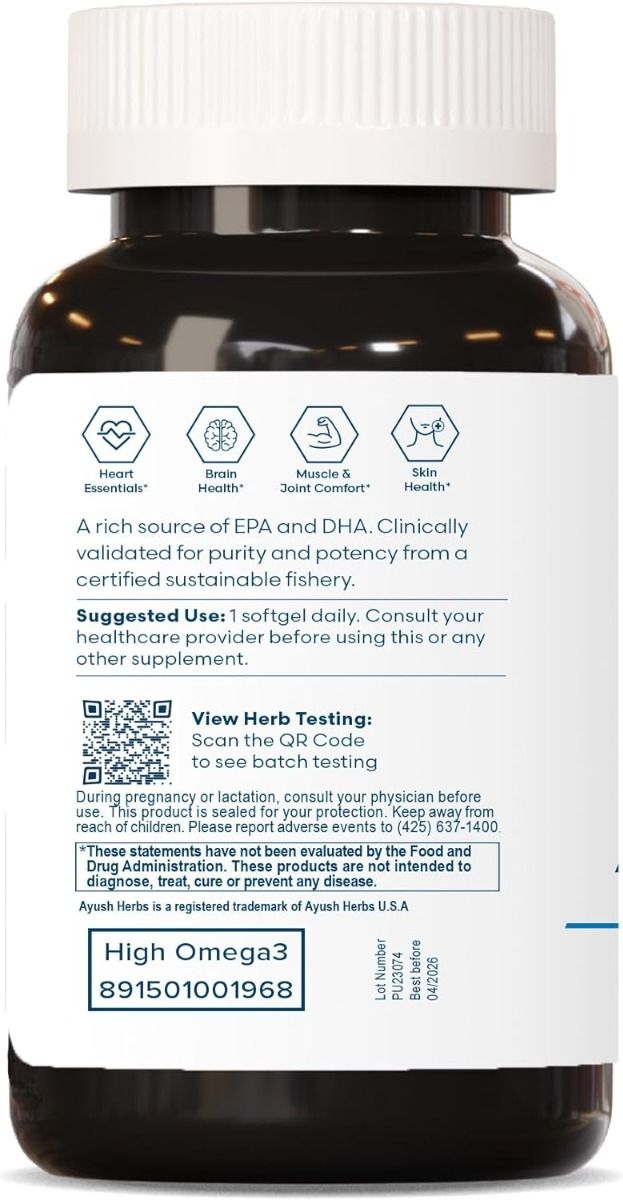 Ayush Herbs fish oil contains concentrated EPA and DHA for a truly potent single capsule dosage. Each softgel provides 750mg of EPA and 250mg of DHA. It is sourced from a sustainable Alaskan fishery, which is MSC-certified since April 2005 and has been responsibly managed for over 30 years. Molecularly distilled, our fish oil exceeds industry standards for purity. The full spectrum of laboratory testing meets and exceeds GOED Voluntary Monograph for Omega-3s.