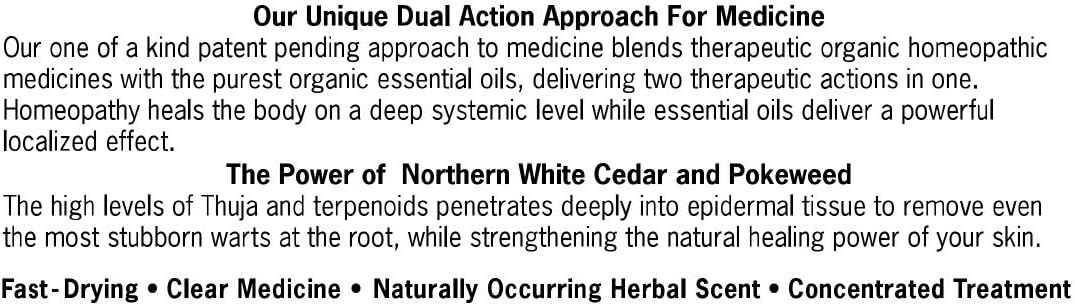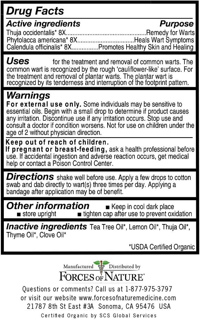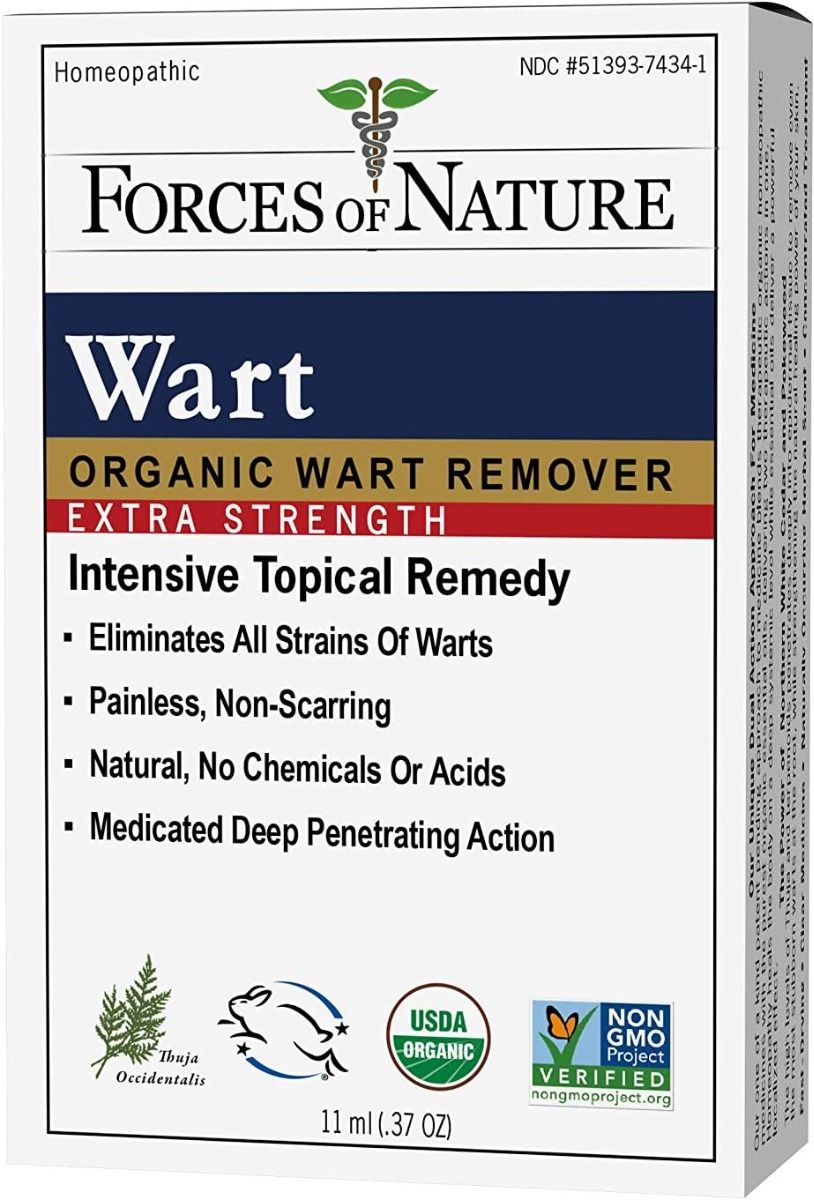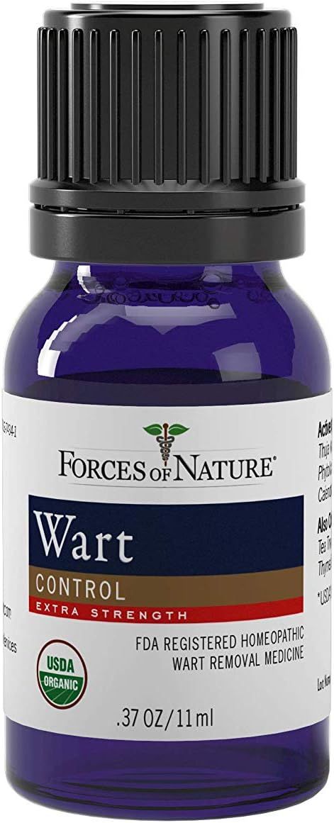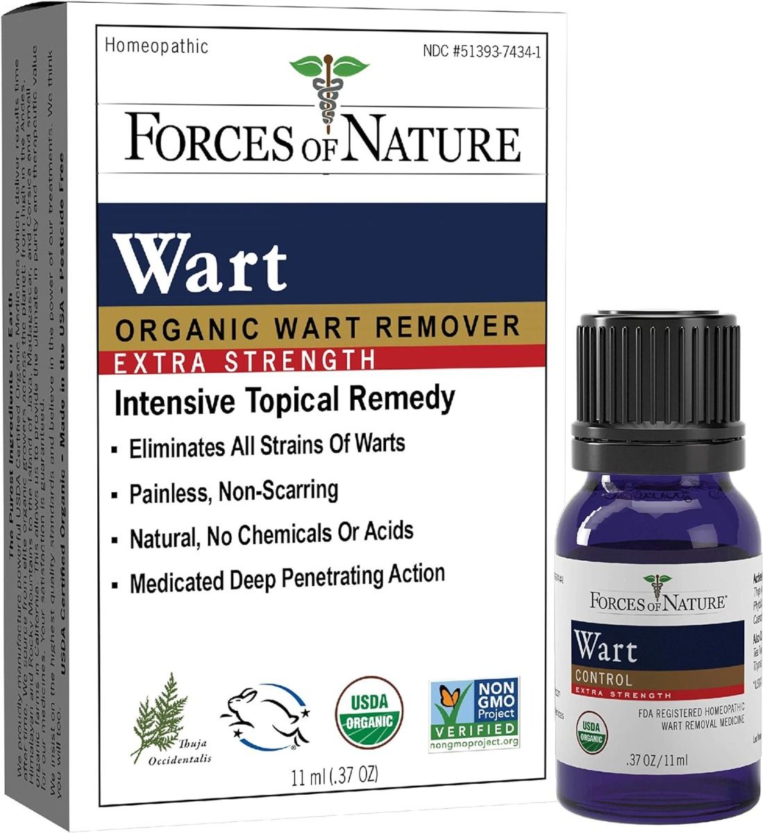 - Heal damaged skin Results are generally experienced in 1-3 weeks. Eliminates Warts Without Scarring Get relief fast! Wart Control Extra Strength customers report nearly immediate wart reduction. Results in Clear Healthy Skin The pharmacy-grade ingredients in Wart Control Extra Strength remove warts while helping healthy skin. Requires No Surgery Warts are eliminated without the use of lasers or other dangerous surgery. Is Doctor Recommended Not only do thousands of customers swear by our product, but Doctors also recommend it often to their patients. Why It Works There are over 200 different strains of the virus causing warts, HPV, and some of them are just plain tough to get rid of. That's we we have increased the potencies of certified organic homeopathic wart removal material and incorporated them into this Extra Strength treatment. Further, we added botanicals rich in geraniols and eugenol. These added botanicals expand and further support the action of the homeopathics. The medicinal plant extracts and botanicals in this extra strength treatment are 100% certified organic, many organically grown in remote regions on the island of Madagascar. The lipophilic formula absorbs deep into skin tissue, where it works on a cellular level to effectively treat resistant warts and help promote healthy skin. This extremely potent wart remover is a proprietary formula manufactured only by Forces of Nature and approved for over the counter sales.