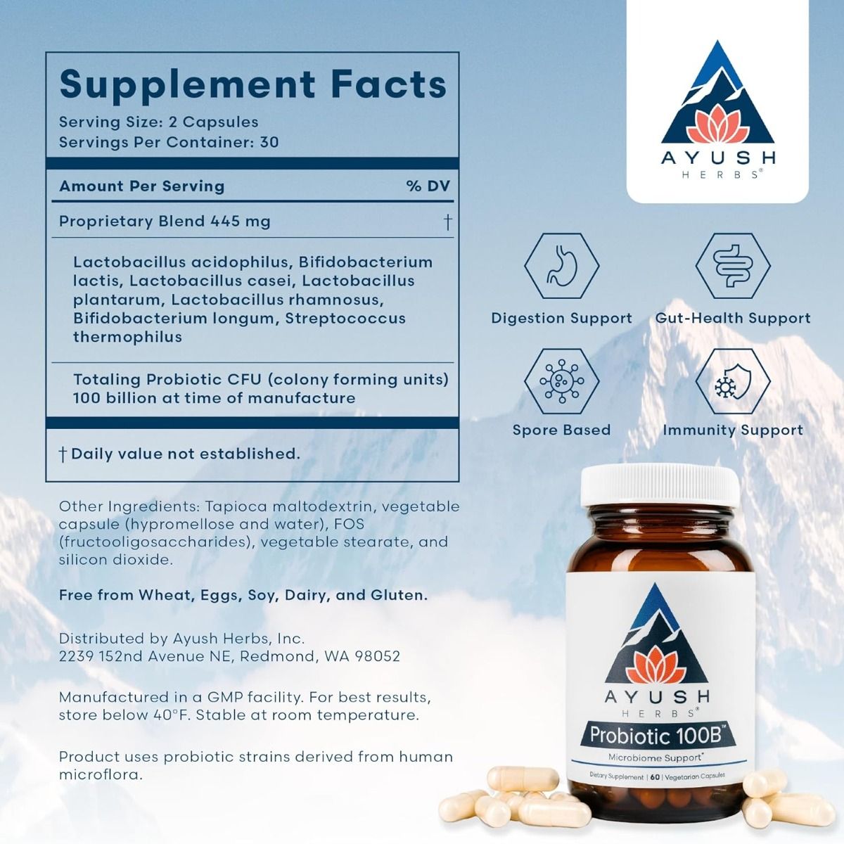 Probiotic 100B™ offers a combination of seven different strains of healthy bacteria of human origin to support a healthy immune system. These cultures are manufactured through a fermentation process and then freeze-dried and blended with fructooligosaccharides (FOS). Shelf-stable for two years at room temperature, the nitrogen-packed capsules guarantee longer life and maintain their stability for years if refrigerated. Probiotic 100B contains the following live strains: L. acidophilus 50%; L. casei 10%; L. plantarum 10%; L. rhamnosus 10%; B. lactis 10%; B. longum 5%; and S. thermophilus 5%.