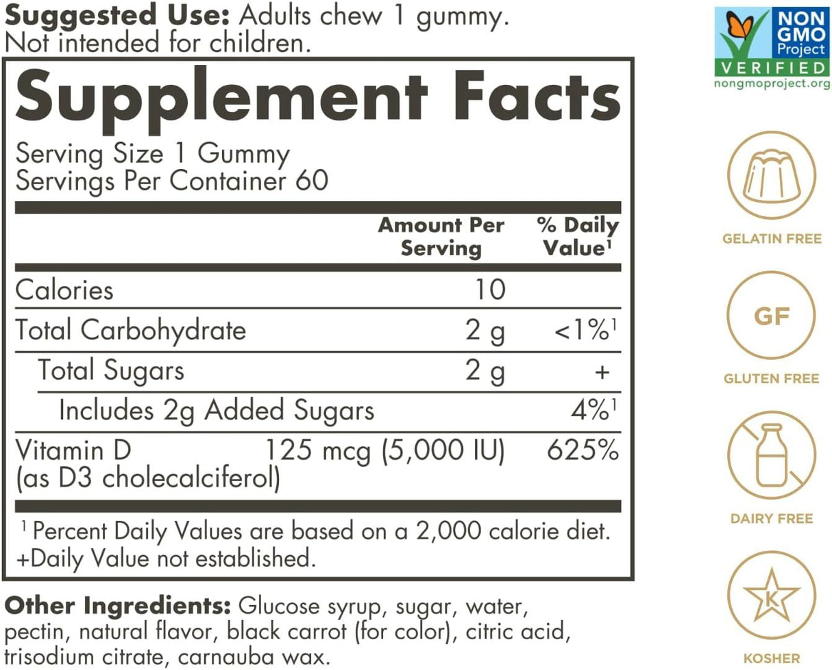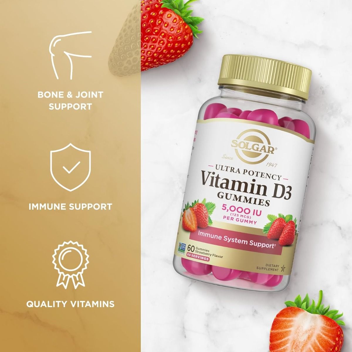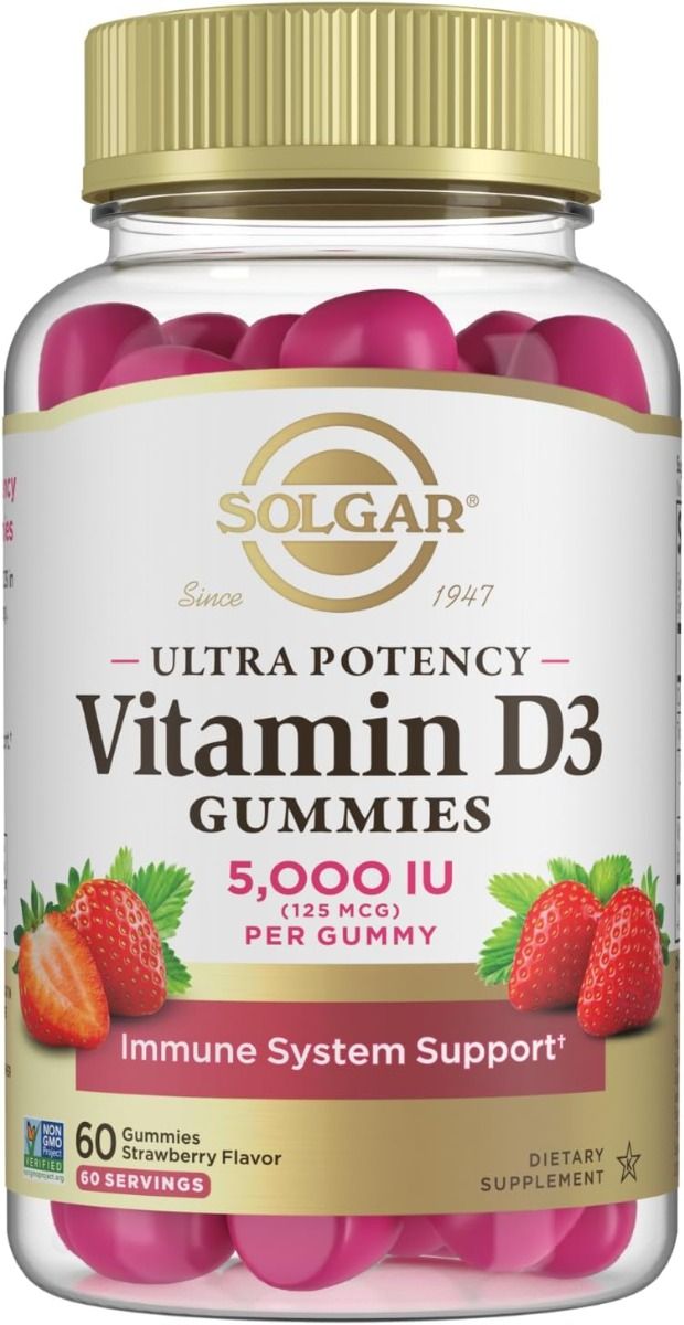 Solgar Ultra Potency Vitamin D3 Gummies offer 5000 IU (125 mcg) of vitamin D3 in just one gummy — the highest potency in a single gummy.