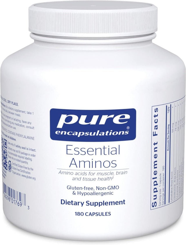 Amino acids are the building blocks for all proteins, making them essential for a number of body functions, including fluid balance, enzyme production, cellular repair and energy metabolism. Amino acids also provide a readily available form of nitrogen, a critical element that forms various compounds such as neurotransmitters and creatine. In humans, protein is composed of 20 amino acids, only some of which the body is able to produce. Those that need to be obtained from exogenous sources are referred to as the essential amino acids. Pure Encapsulations Essential Aminos formula is based on the ratios of essential amino acids from high biological value (BV) protein sources. Proper intake of these amino acids is important for the synthesis, repair, and metabolism of muscle, cells, and tissues. A number of studies have been conducted at the University of Texas, including a clinical study that suggested essential amino acid supplements may support muscle anabolism in the elderly. Another clinical study performed at the university's metabolism unit in the Department of Surgery indicated that supplementing with essential amino acids promotes healthy muscle protein synthesis after resistance exercise.*
